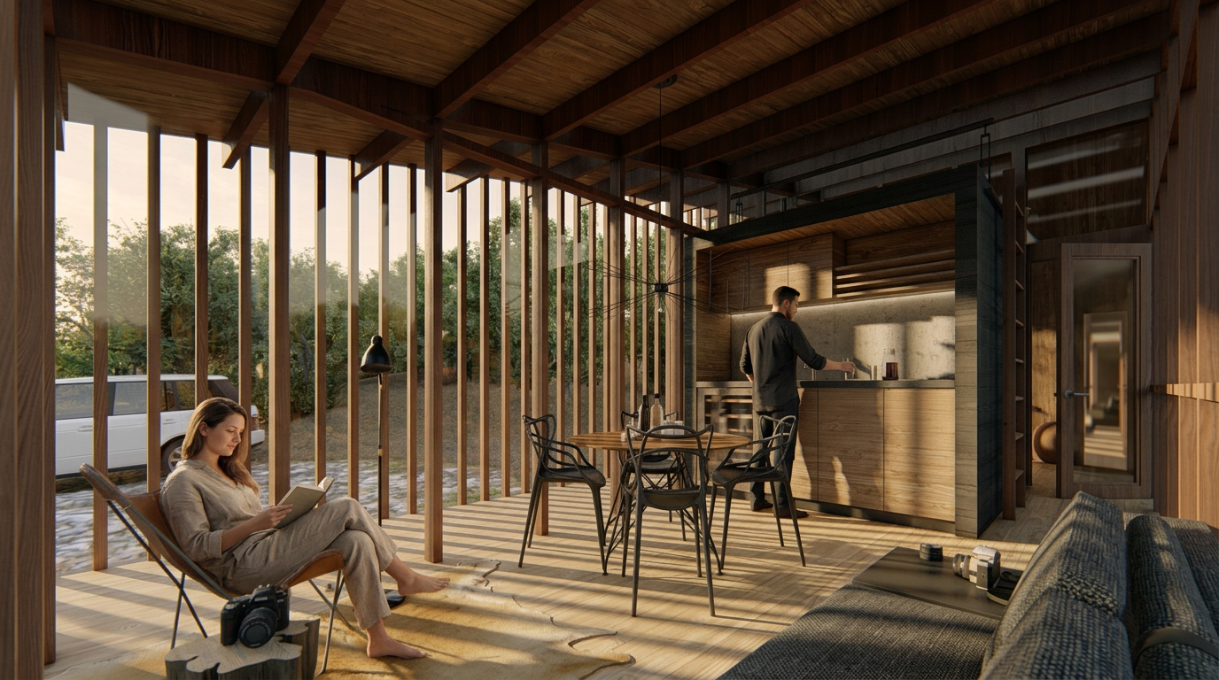 Los espacios mínimos de los refugios (20 m²), contienen solo lo esencial. En esa reducción aparece una forma de libertad: menos objeto, más experiencia.