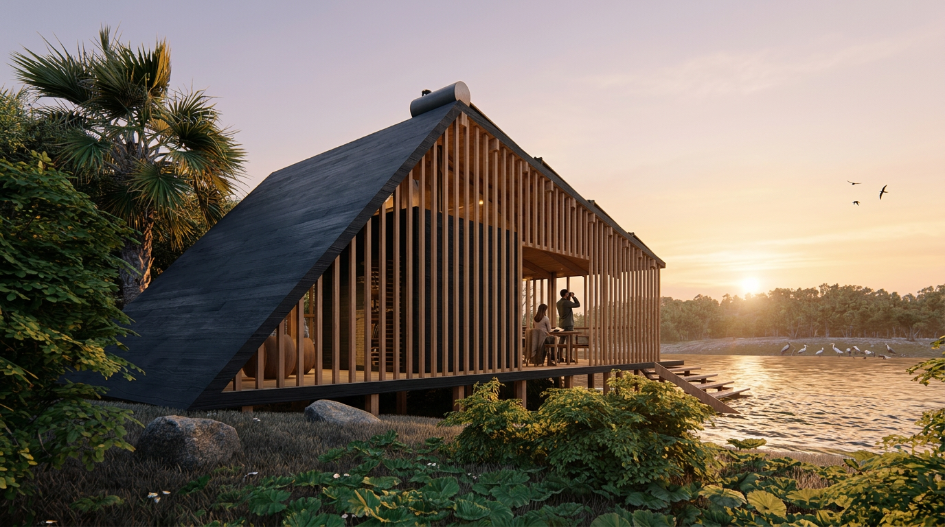 Implantado en el territorio del Chaco Salteño, el proyecto se aproxima al Río del Pelícano como quien llega sin perturbar. En un clima extremo, donde el calor define el ritmo del habitar, la arquitectura no se impone: se repliega, observa, aprende del lugar.
